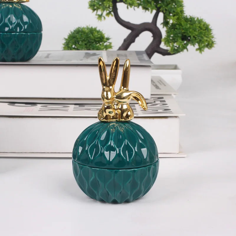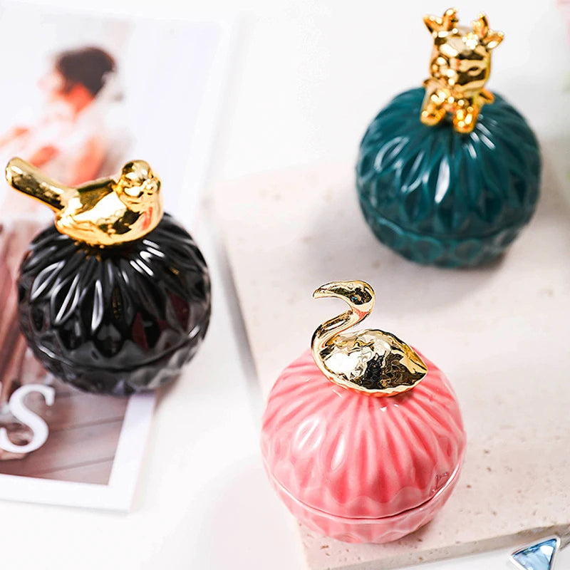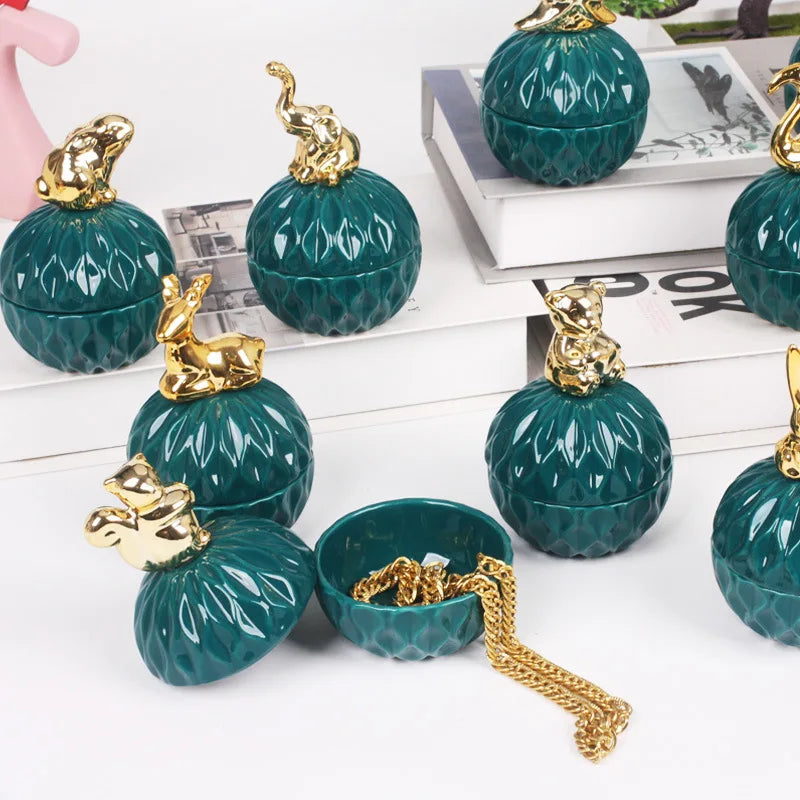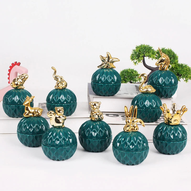 Nordic Dark Green Ceramic Animal Electroplating Ornaments Creative Girl Jewelry Ring Box Sealed Storage Box Hand Gift Mini Jar