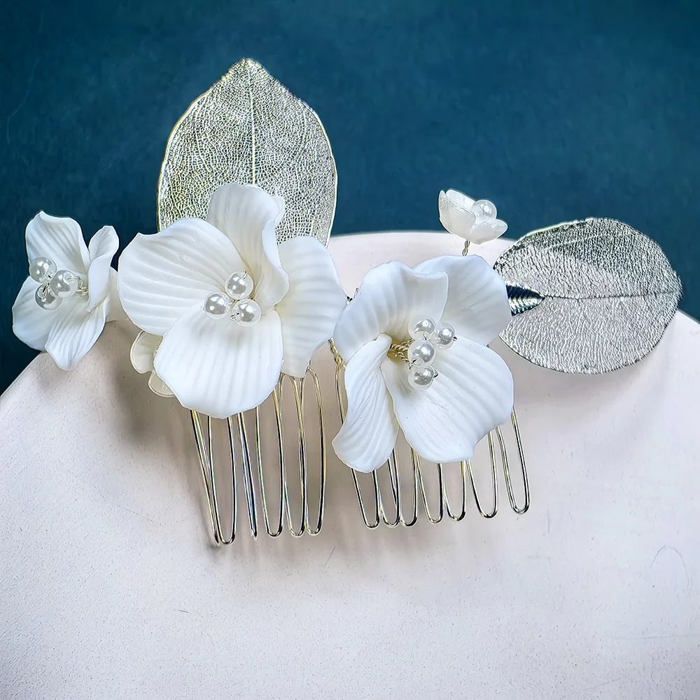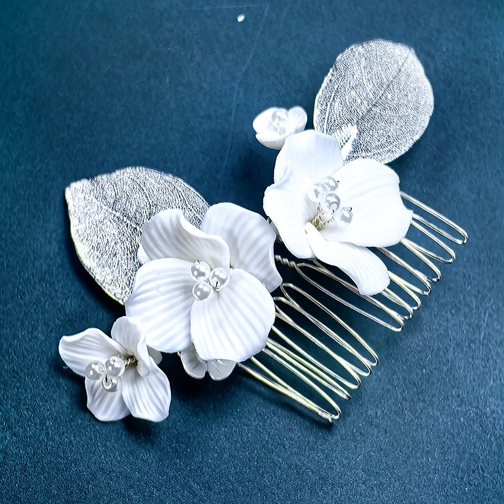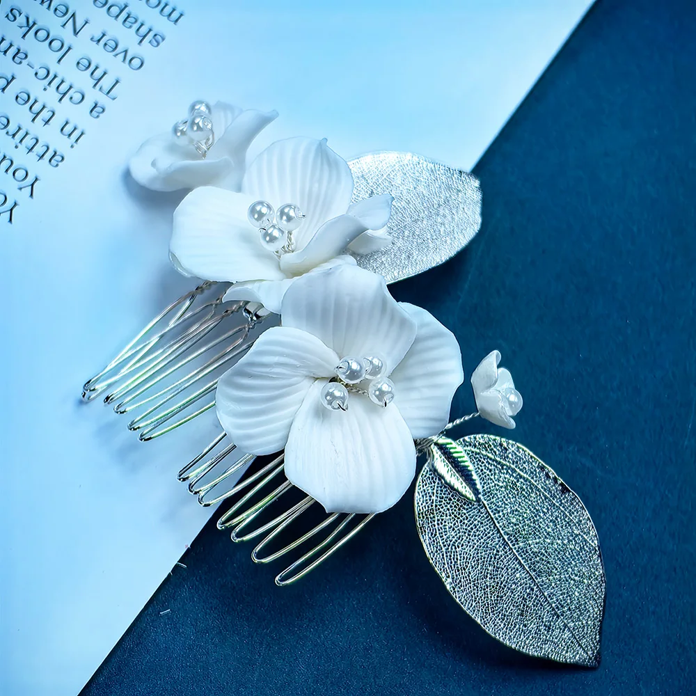 Porcelain flower bridal wedding hair ornament, silver leaf bridal tiara, pearl hair ornament for ladies and girls